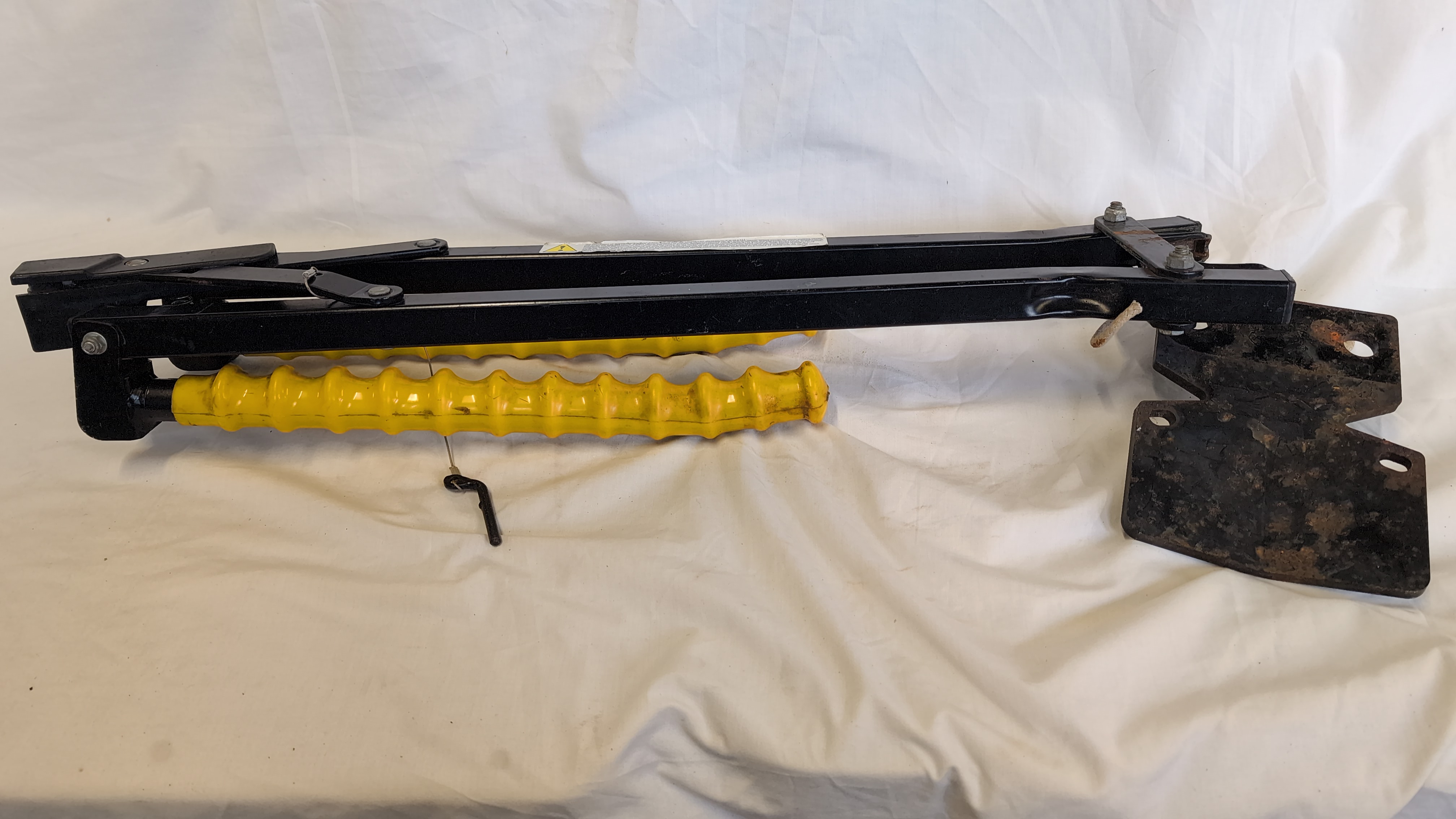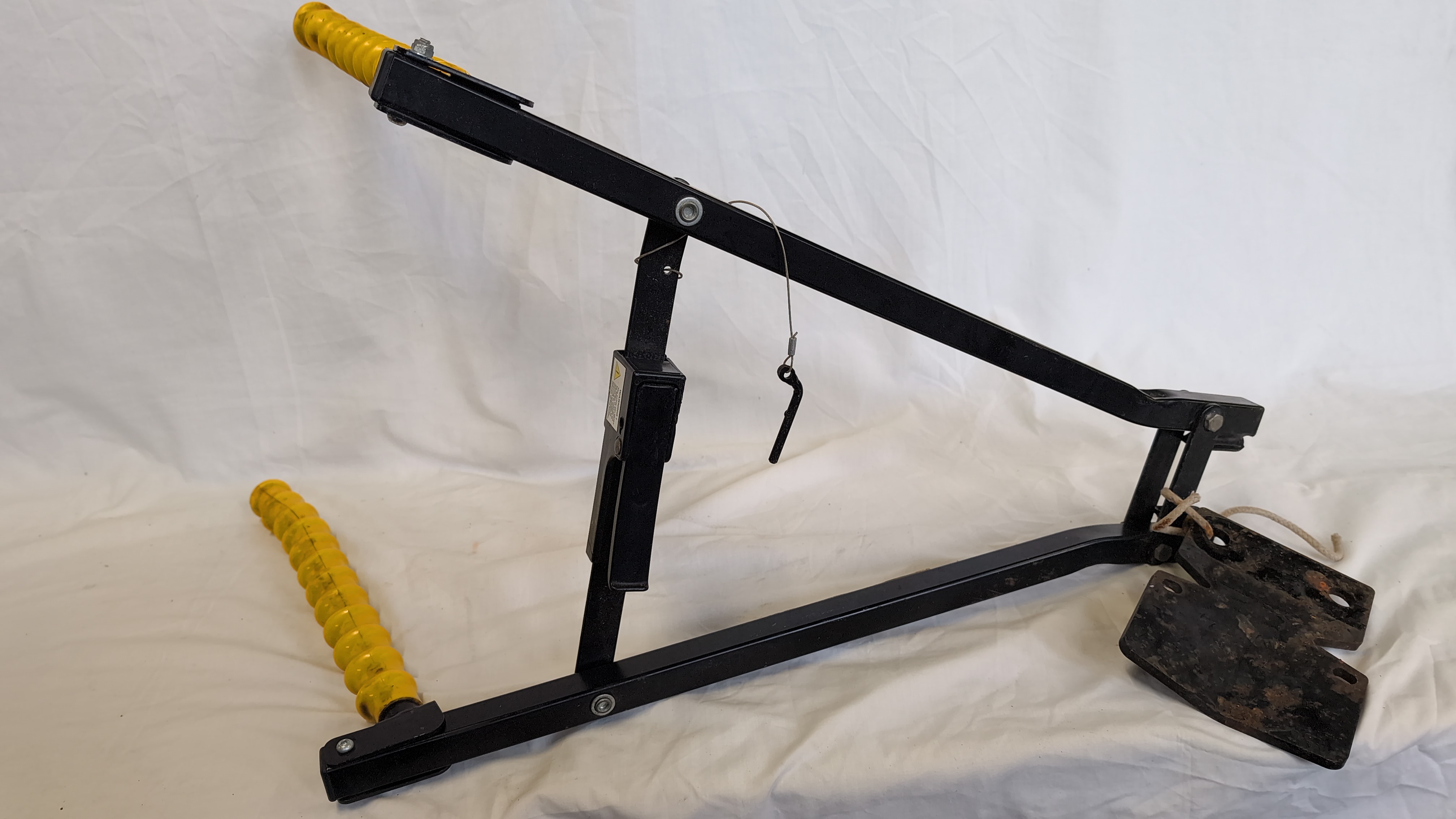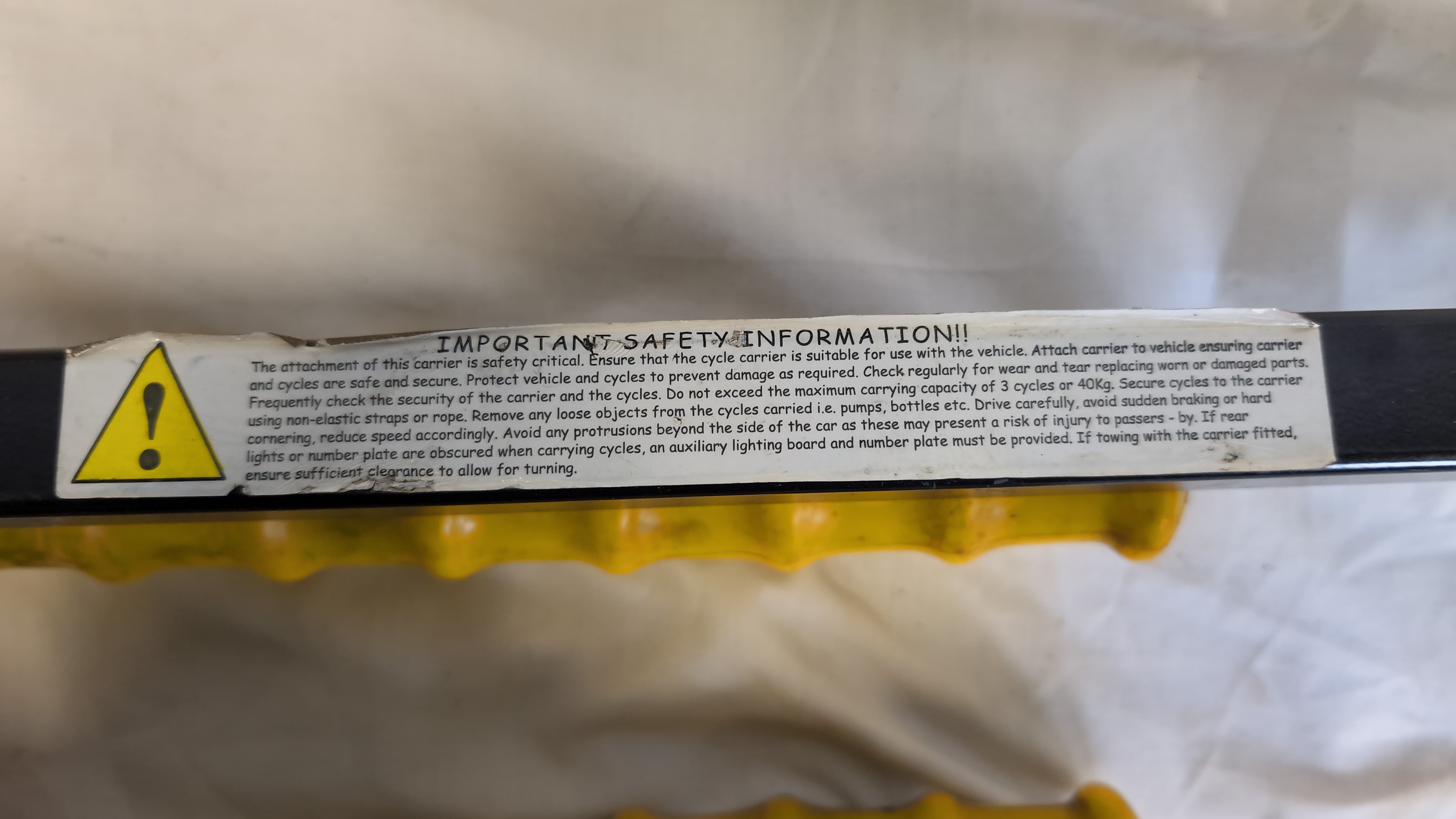 This item is a folding cycle carrier designed for bolt-on attachment to a vehicle towbar flange. The frame is constructed from black painted steel members and features a central folding mechanism. It incorporates two horizontal support arms which are fitted with yellow corrugated plastic protective sleeves to cushion bicycle frames. The carrier includes a heavy duty black metal mounting plate with pre-drilled apertures for installation behind a standard towball. A safety retaining pin is secured to the frame by a wire lanyard. An adhesive safety label is present on the upper arm which provides usage instructions and specifies a maximum carrying capacity of 3 cycles or 40kg. A smaller yellow triangular warning decal is located on the central vertical support.