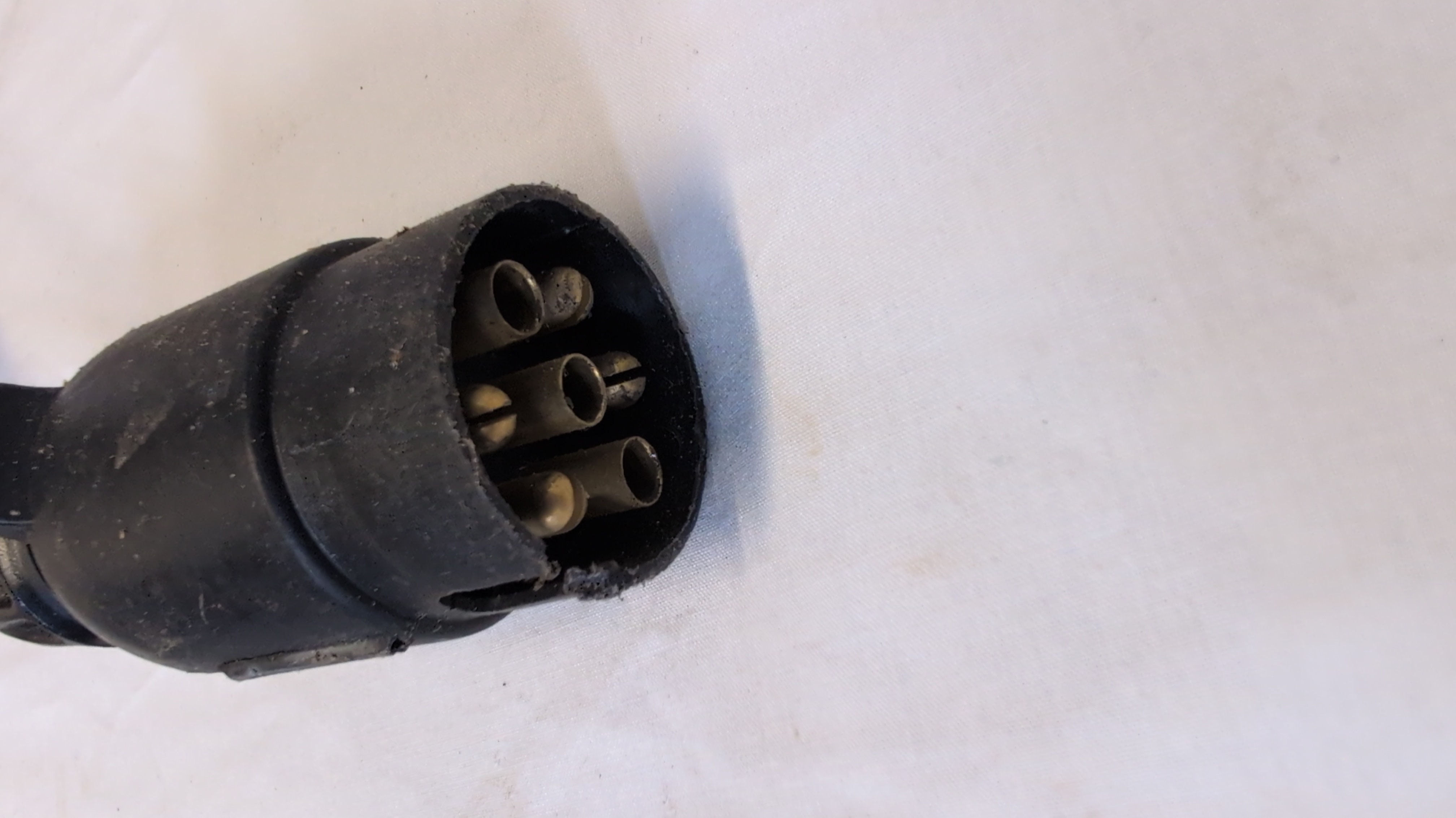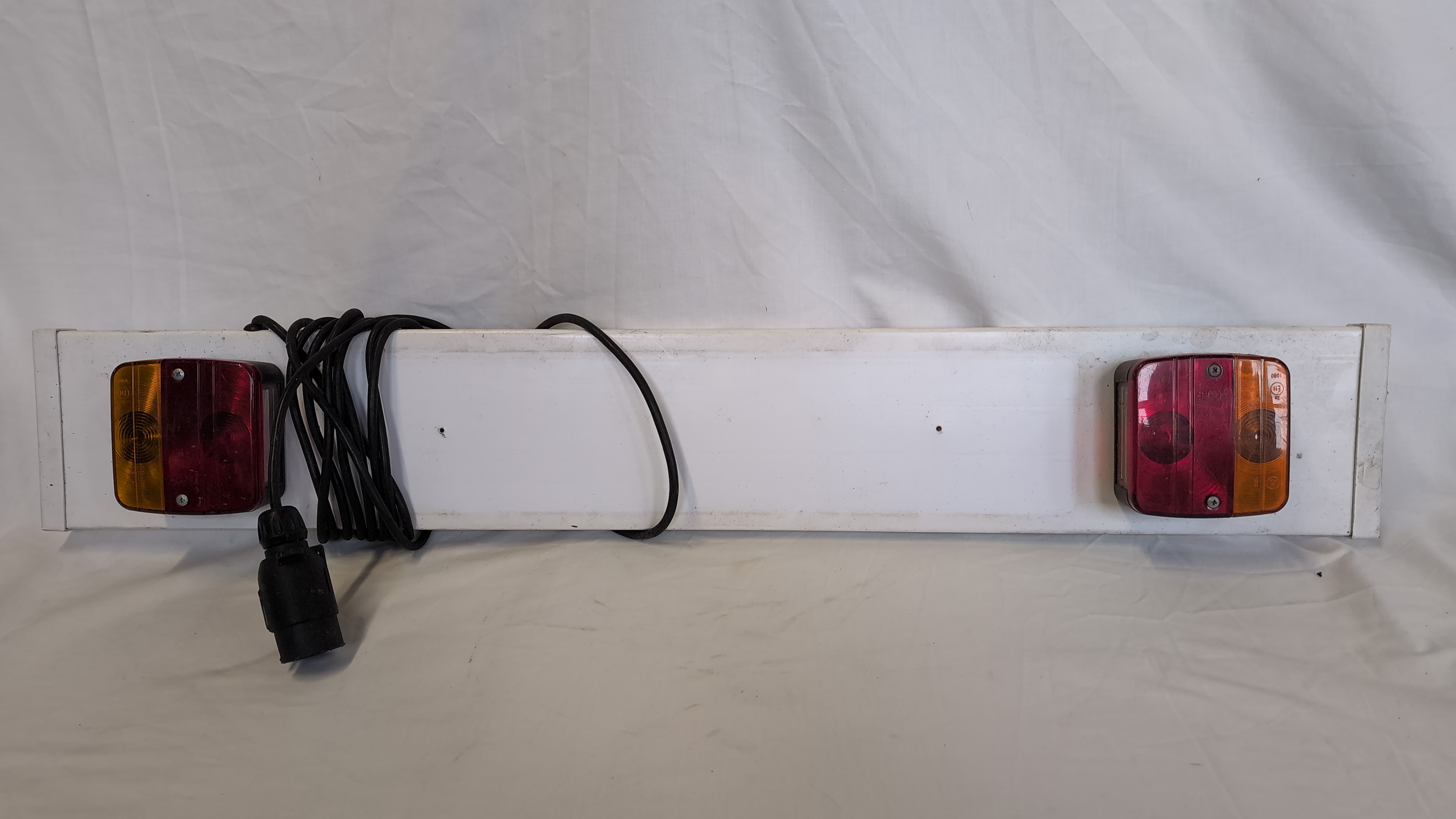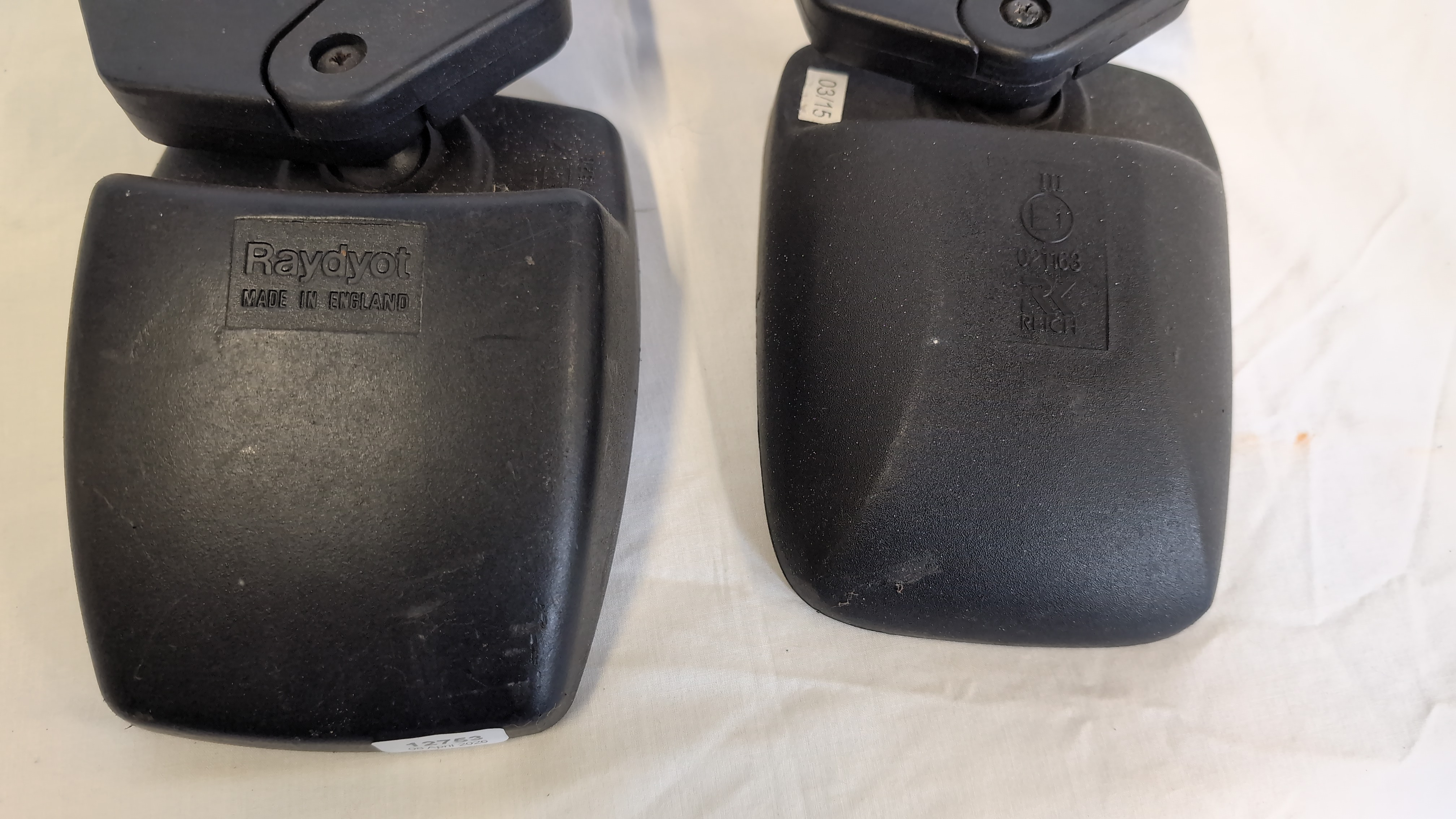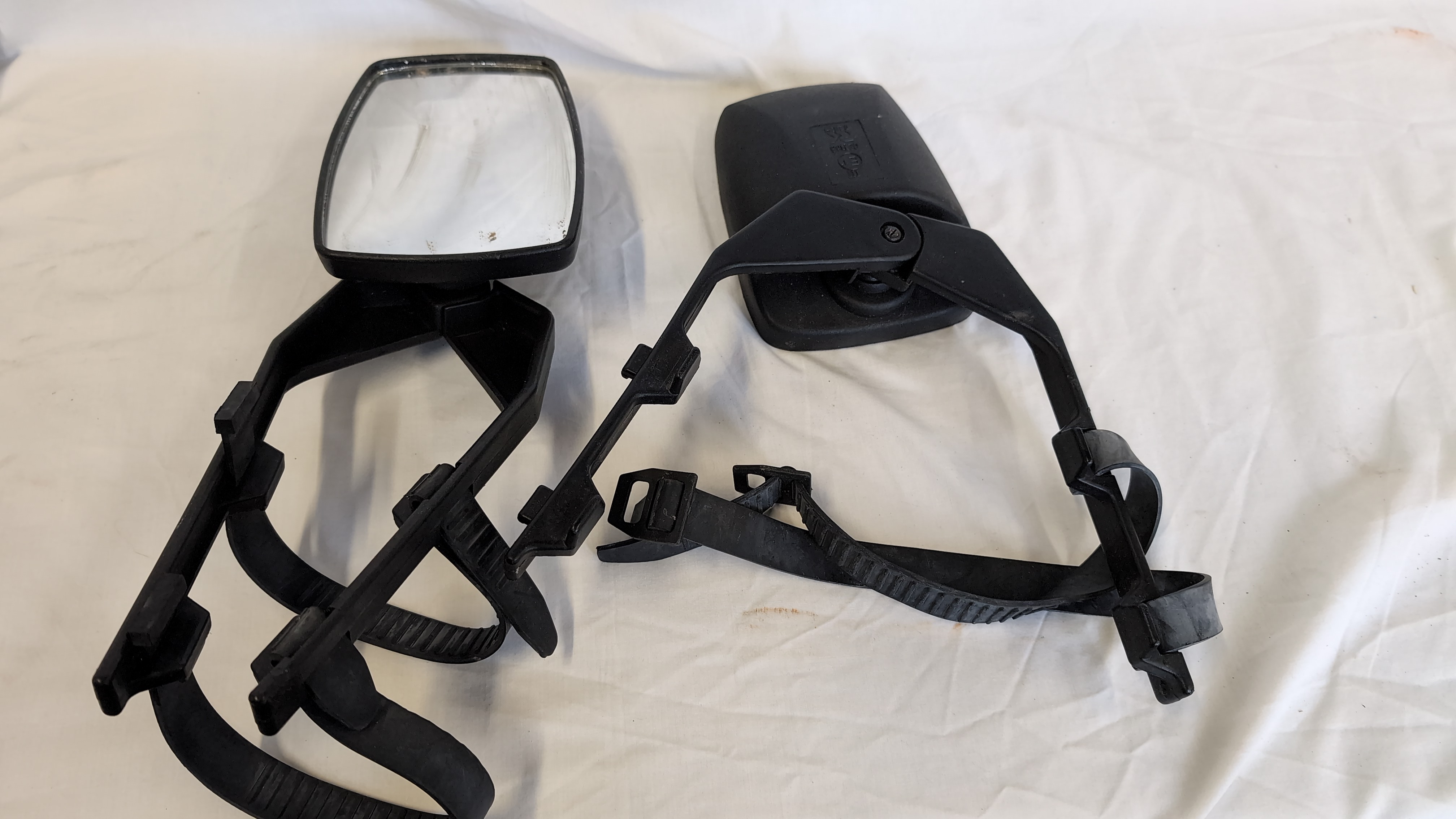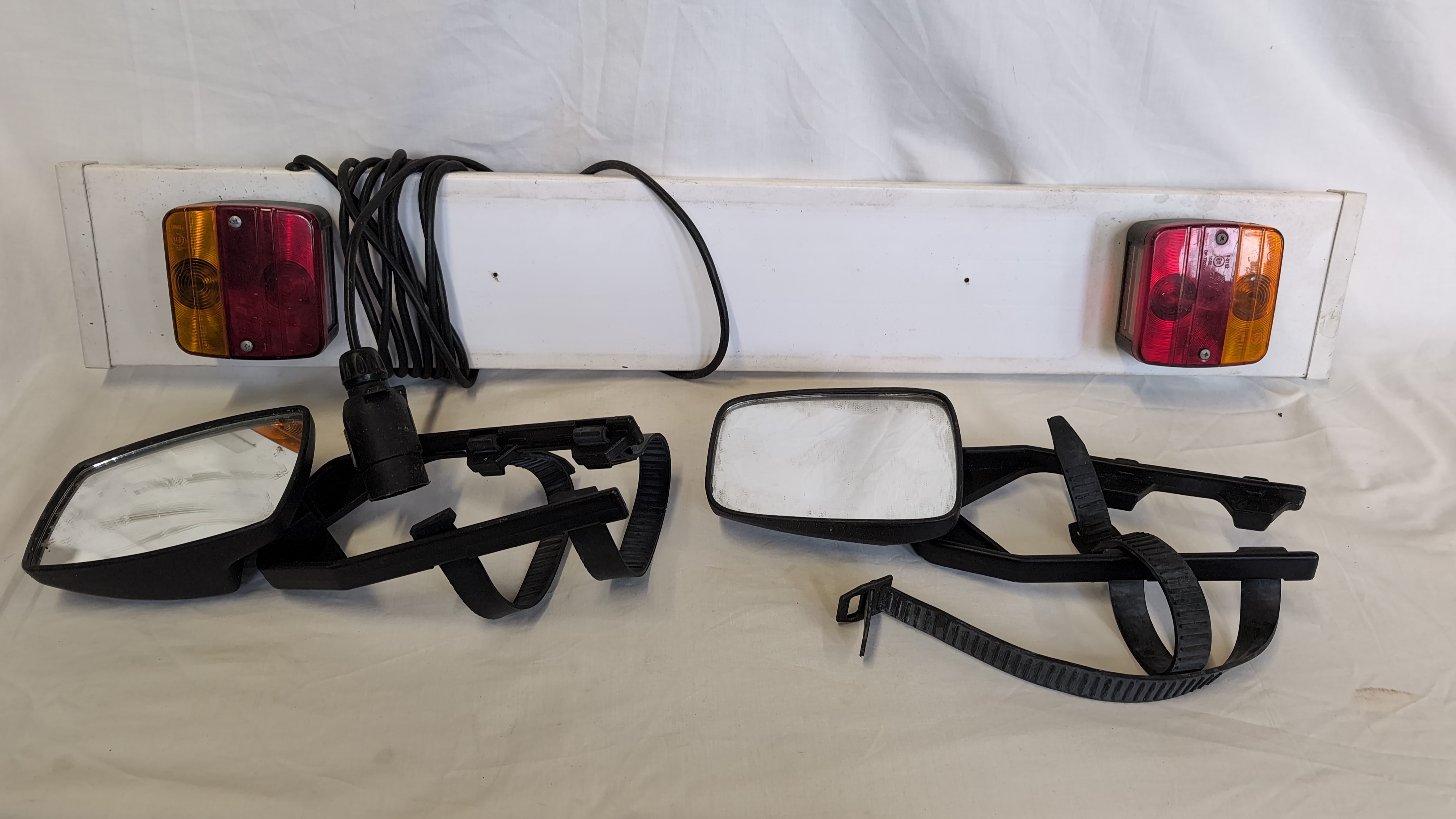 This lot consists of a Trojan trailer lighting board and two individual universal-fit towing mirrors. The white plastic lighting board is equipped with two multi-functional rear lamps providing indicator, tail, and brake light functions. The lamp lenses feature molded E-marks and are stamped MADE IN ENGLAND. The board includes a long black electrical cable terminating in a standard UK 7-pin 12N round plug. The two black plastic towing mirrors are designed for universal fitment, intended to strap onto existing vehicle wing mirrors. One mirror casing is marked with the Raydyot brand name and MADE IN ENGLAND. The second mirror casing is marked REICH and bears the markings III, E1, and the part number 021163, with an adhesive sticker dated 03/15. The mirrors are compatible with most standard vehicle wing mirrors using the integrated adjustable straps.