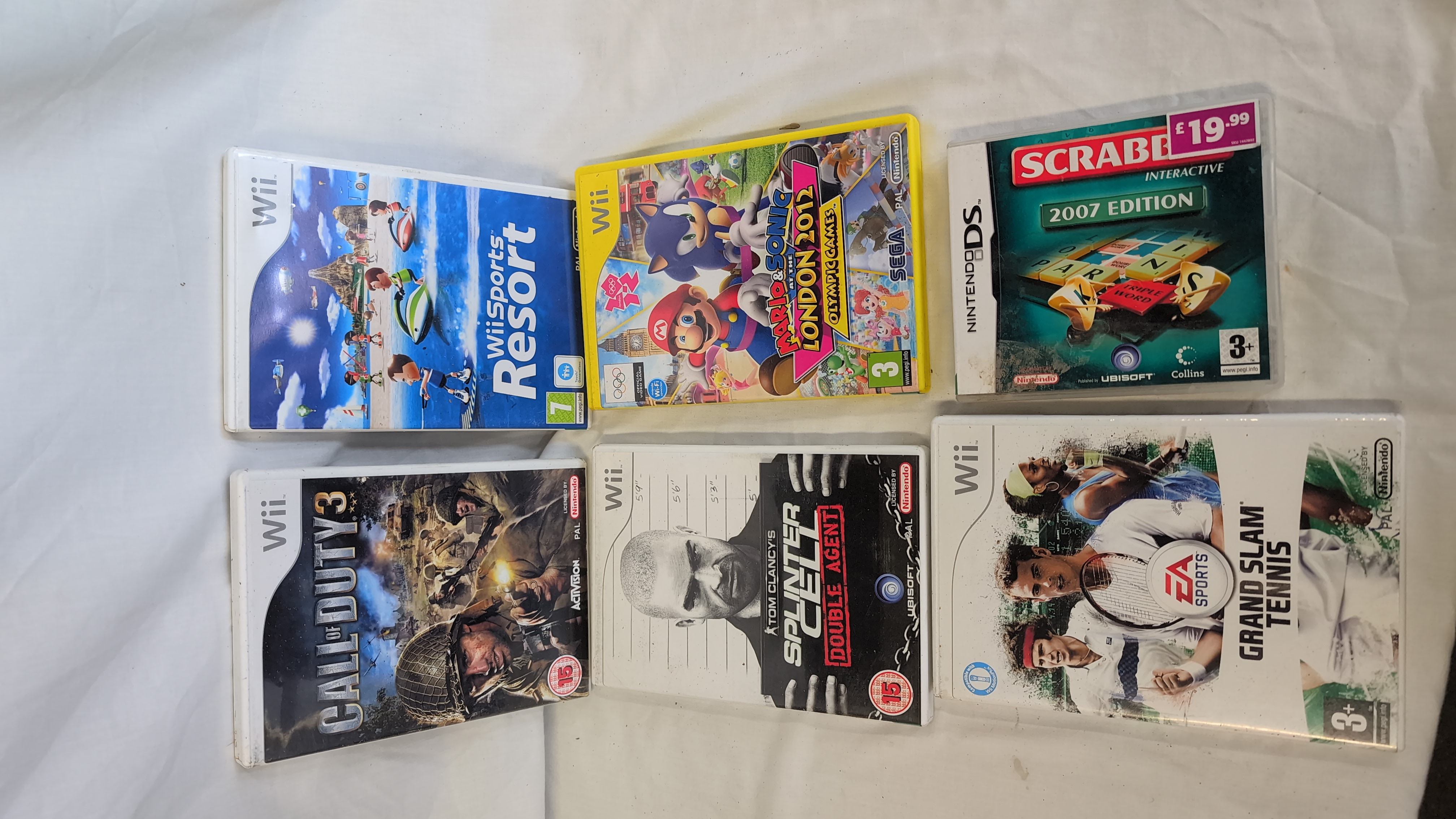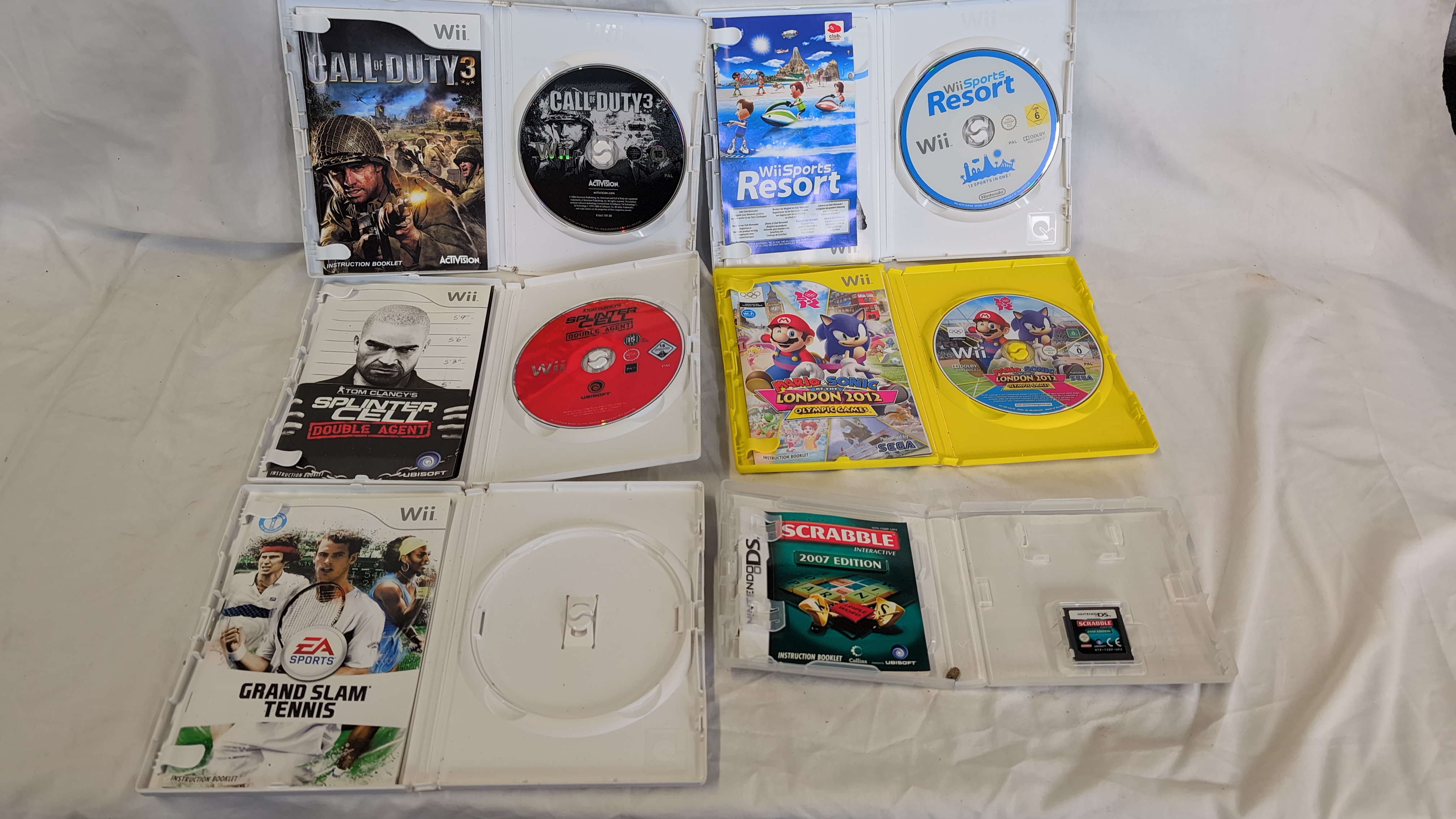 A collection of video games for the Nintendo Wii and Nintendo DS platforms from publishers including Nintendo, SEGA, Activision, Ubisoft, and EA Sports. The lot features five titles for the Wii console: Call of Duty 3 (PEGI 15), Wii Sports Resort (PEGI 7), Tom Clancy’s Splinter Cell Double Agent (PEGI 15), Mario & Sonic at the London 2012 Olympic Games (PEGI 3), and Empty Case with Leaflets EA Sports Grand Slam Tennis (PEGI 3). Also included is one title for the Nintendo DS: Scrabble Interactive 2007 Edition (PEGI 3). The games are all PAL region versions intended for the UK and European markets. Each title is housed in its original plastic retail case, with the Mario & Sonic game presented in a yellow case.