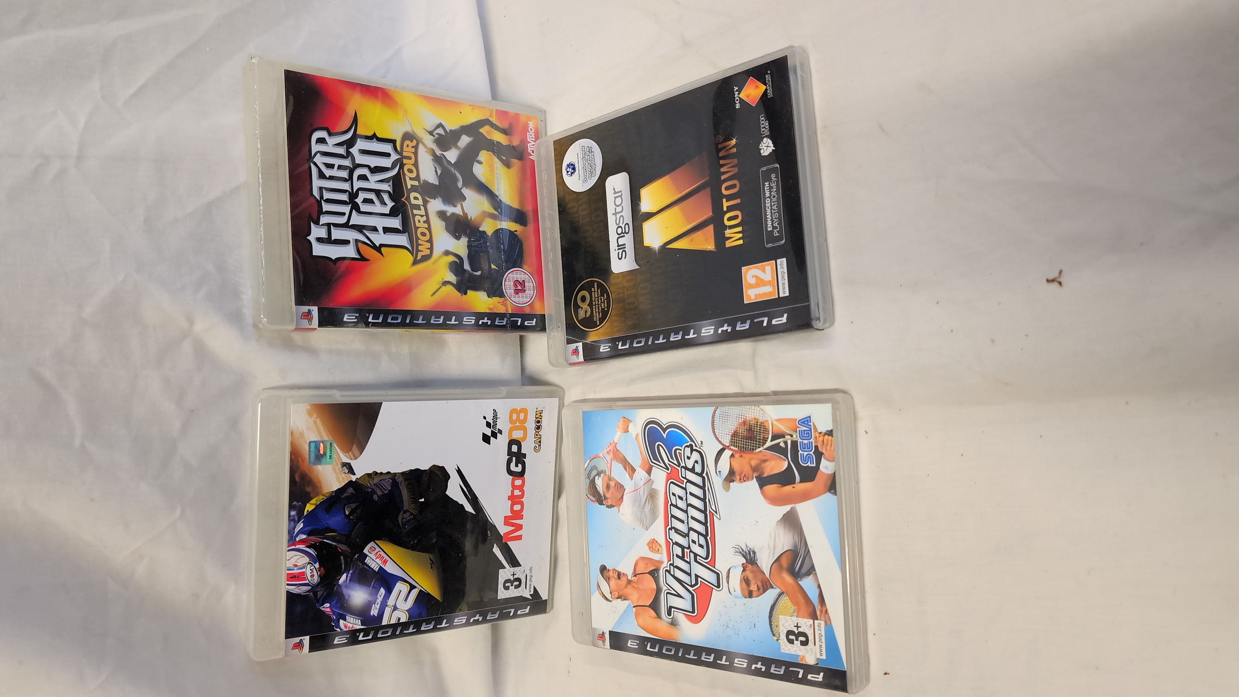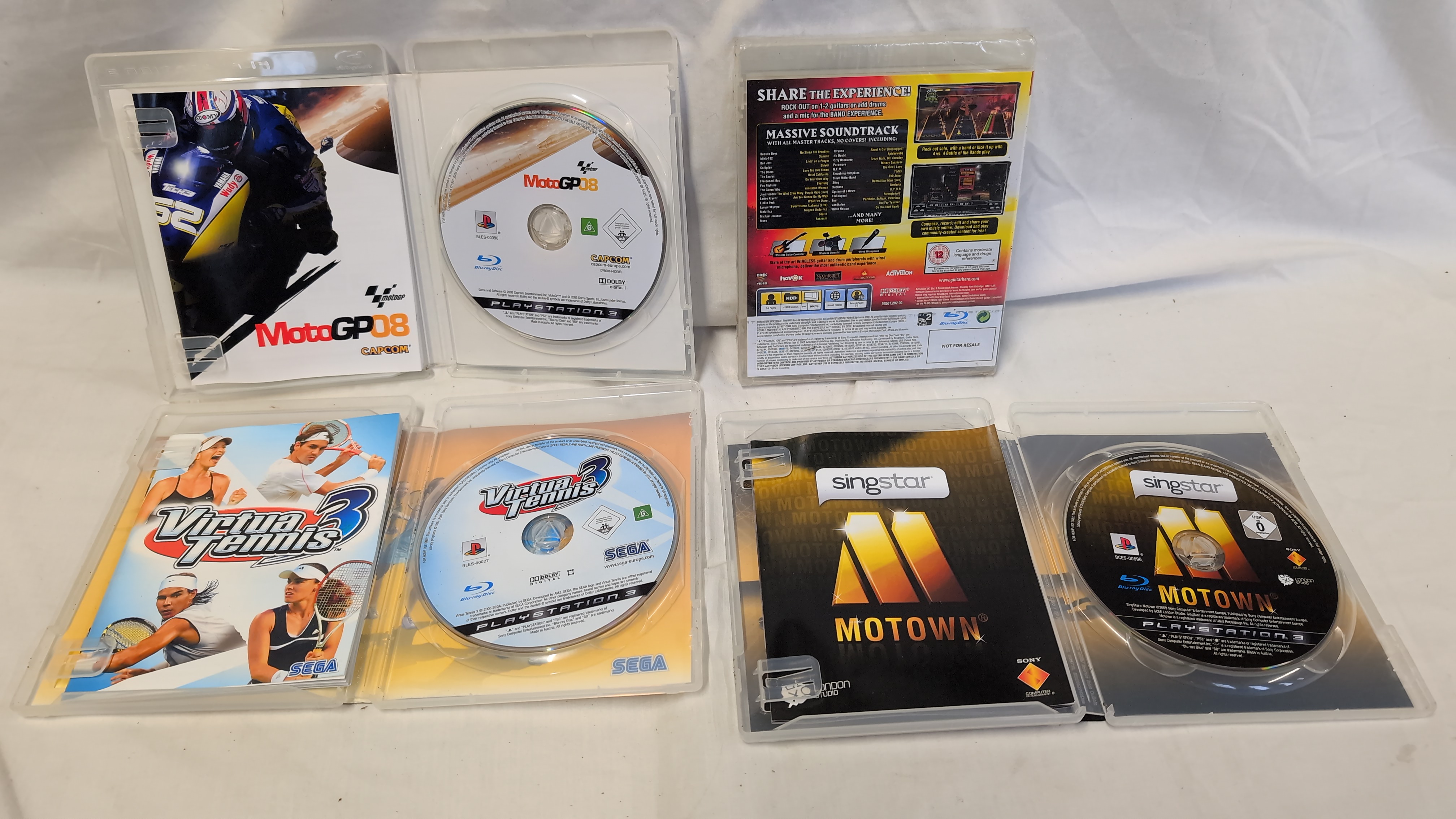 This collection consists of several video games for the Sony PlayStation 3 console, all produced for the PAL region. The items include Guitar Hero World Tour, published by Activision, with its original plastic case and paper cover art. MotoGP 08, published by Capcom, is present with its original case, printed manual, and Blu-ray disc. Virtua Tennis 3, published by SEGA, is included with its original case, manual, and Blu-ray disc. SingStar Motown, published by Sony Computer Entertainment, is also present with its case, manual, and Blu-ray disc. All games feature official PlayStation 3 branding and PEGI age ratings.