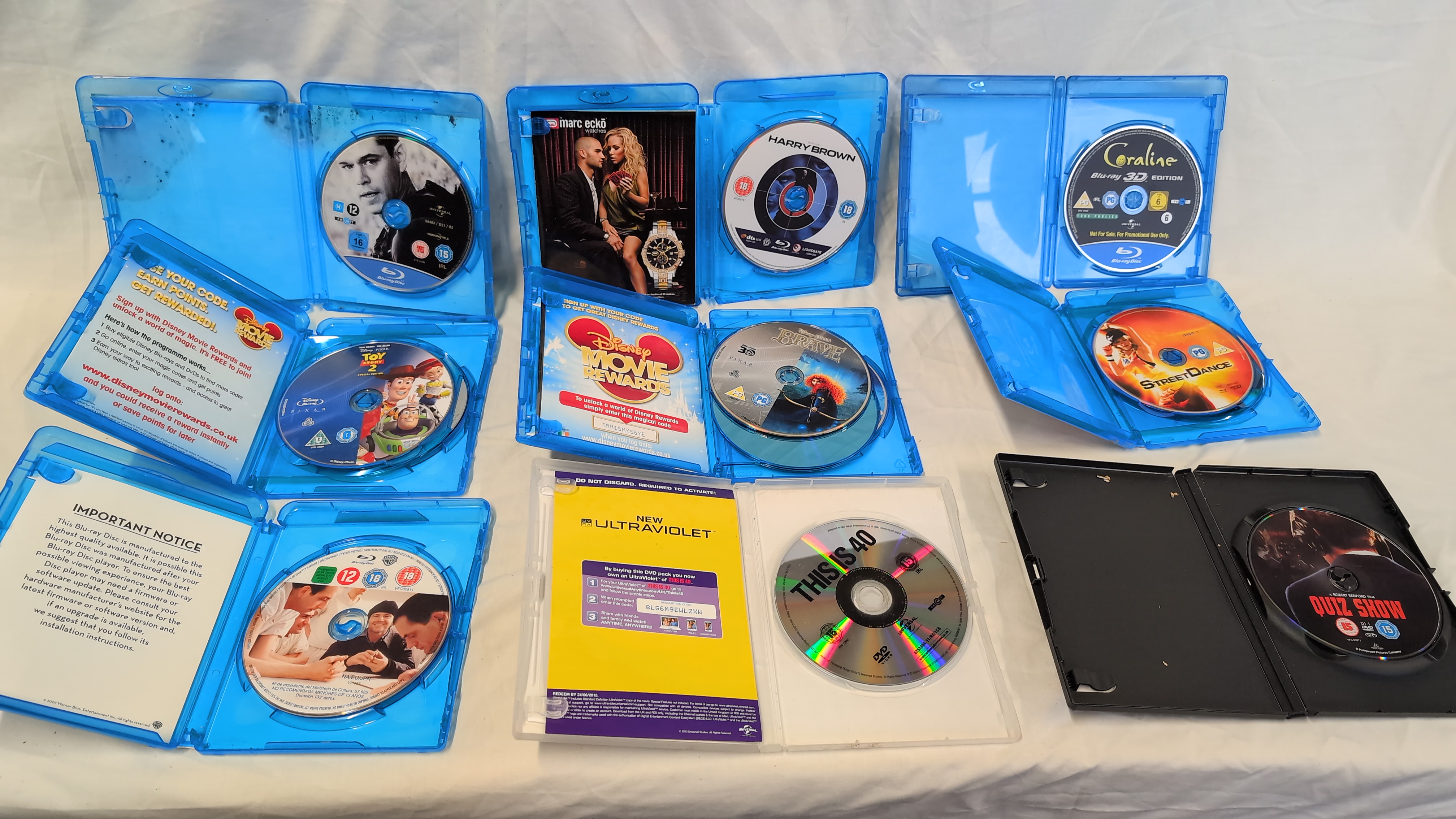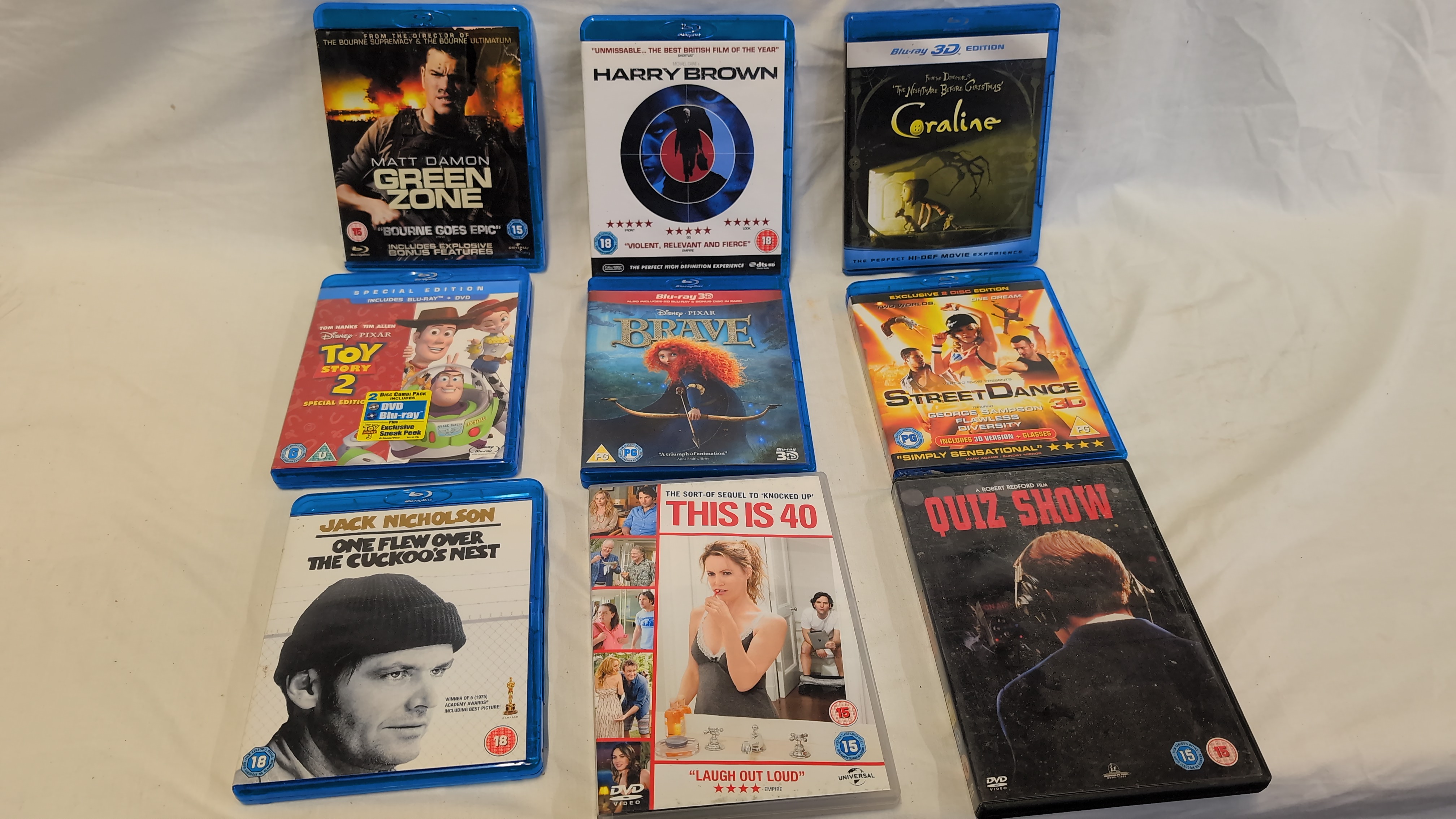 A collection of feature films across various formats including Blu-ray, Blu-ray 3D, and DVD, specifically produced for the United Kingdom market. This assortment includes titles from major studios such as Universal, Disney Pixar, Warner Bros., and Hollywood Pictures. The films featured include Green Zone, Harry Brown, Coraline, Toy Story 2, Brave, StreetDance, One Flew Over the Cuckoo’s Nest, This Is 40, and Quiz Show. Each item is housed in its respective plastic keep case, with several including original paper inserts such as Disney Movie Rewards and Ultraviolet digital code leaflets. All items bear British Board of Film Classification (BBFC) age rating symbols on the covers and disc artwork, ranging from Universal (U) to 18.
