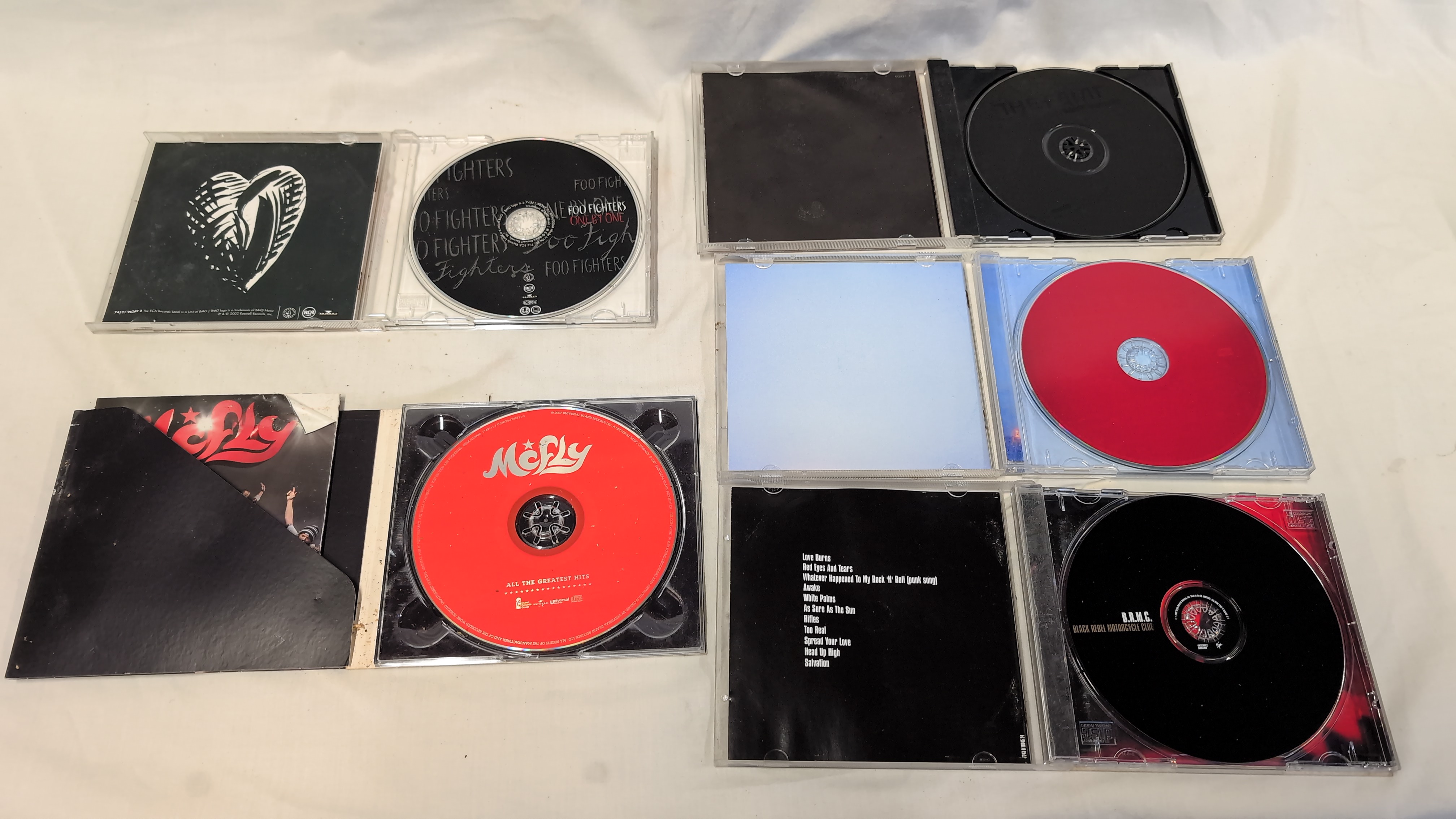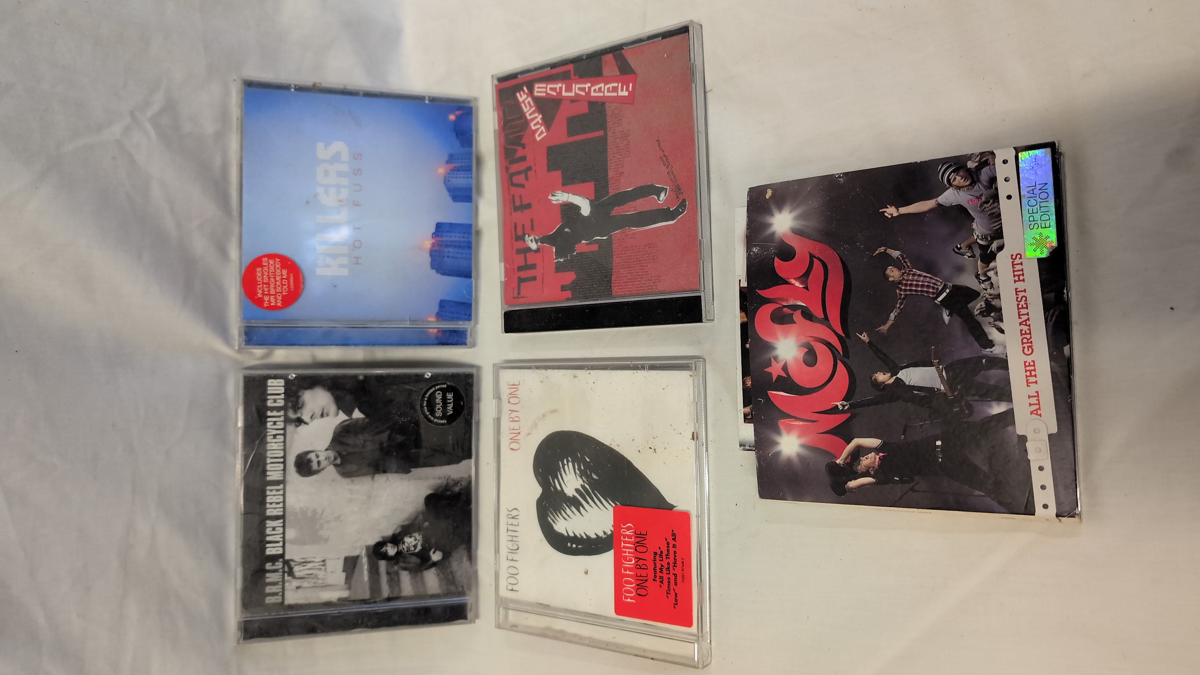 A collection of studio and compilation albums on compact disc. The group comprises five titles from the early to mid-2000s. The Killers – Hot Fuss (2004) is the band’s debut album, housed in a blue jewel case with a red circular promotional sticker and containing a red disc. Danse Macabre – The Family (2002) features stylized red and black cover art with a black disc. McFly – All The Greatest Hits (2007) is a special edition compilation presented in a cardboard gatefold sleeve with an internal plastic tray and a red disc. Black Rebel Motorcycle Club – B.R.M.C. (2001) is a self-titled debut featuring a Sound Value retail sticker and a black disc. Foo Fighters – One By One (2002) features stylized heart artwork on the cover with a red tracklist sticker and a patterned disc.